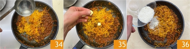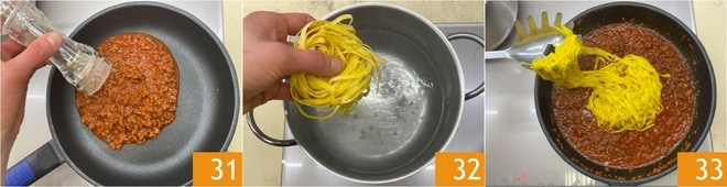 Nachdem Sie alle Tajarin zubereitet haben, geben Sie das Wurstragout in eine Pfanne, pfeffern Sie 31 und erhitzen Sie es bei schwacher Hitze. In der Zwischenzeit bringen Sie einen Topf mit Salzwasser zum Kochen und kochen Sie die Tajarin, achten Sie darauf, nicht zu viele auf einmal einzutauchen 32. Sobald sie an die Oberfläche kommen, abtropfen lassen und zur Sauce in die Pfanne geben 33.