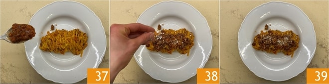 Vervollständigen Sie die Teller mit weiterem Ragout 37, Pfeffer und Parmesan 38. Ihre Tajarin 30 Eigelb mit Wurstragout sind bereit, genossen zu werden 39!