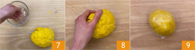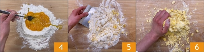 Beginnen Sie damit, die Eigelbe mit einer Gabel zu zerdrücken, um sie mit dem Mehl zu vermischen 4. Sobald die Mischung Form annimmt, helfen Sie sich mit einem Teigschaber, um alle Zutaten zu sammeln 5, und kneten Sie dann etwa 10 Minuten lang mit den Händen weiter 6.