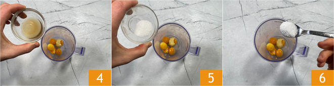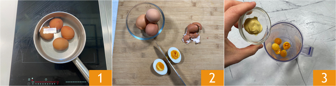 Um die japanische Mayonnaise zuzubereiten, gebt 4 Eier in einen Topf mit kaltem Wasser; ab dem Zeitpunkt des Aufkochens 10 Minuten kochen lassen 1. Kühlt sie in kaltem Wasser, dann pellt sie 2 und gebt nur die Eigelbe und den Senf in den Mixbehälter 3. Die Eiweiße könnt ihr für andere Rezepte verwenden.