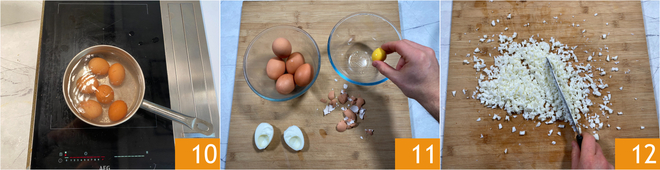 Weiter zur Zubereitung des Tamago-Sandwiches. Gebt 6 Eier in einen Topf mit kaltem Wasser, bringt es zum Kochen und zählt 10 Minuten 10. Kühlt die Eier in kaltem Wasser ab und pellt sie dann, dabei Eigelbe und Eiweiße trennen 11. Die Eiweiße grob mit dem Messer hacken 12.
