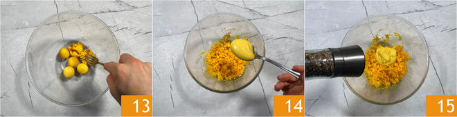 Drückt die Eigelbe in einer Schüssel 13 und gebt 100 Gramm japanische Mayonnaise 14, Salz und Pfeffer 15 dazu; gut vermischen.