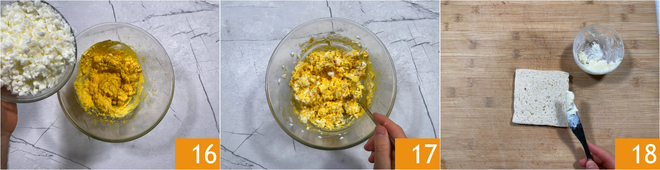 Gebt die gehackten Eiweiße hinzu 16 und rührt noch einmal um 17. Bestreicht jede der 8 Brotscheiben mit 10 Gramm weicher Butter 18.