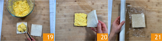 Dann füllt ihr die Brote großzügig mit der Eiermasse 19 und setzt jeweils eine weitere gebutterte Scheibe darauf 20. Wickelt das Sandwich in Frischhaltefolie ein 21