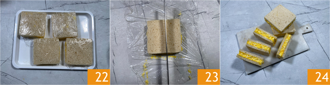 Habt ihr alle zusammengesetzt 22, stellt sie für etwa eine halbe Stunde zum Festwerden in den Kühlschrank. Entfernt die Folie und schneidet sie traditionell in der Mitte durch 23. Fertig sind eure Tamago-Sandwiches 24.