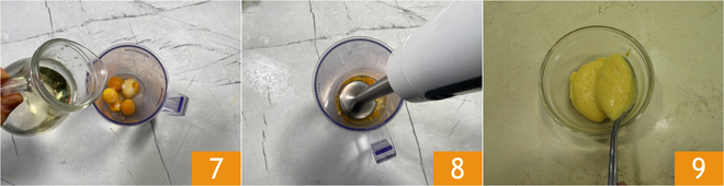 Gießt schließlich das Öl 7 dazu und püriert mit dem Stabmixer 8, bis eine glatte, sämige Sauce entsteht. Gebt sie in eine kleine Schüssel und bewahrt sie bis zur Verwendung im Kühlschrank auf 9.