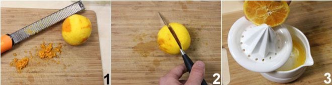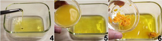 Gießen Sie in eine Schüssel das extra native Olivenöl 4, den Orangensaft 5 und die abgeriebene Schale 6.