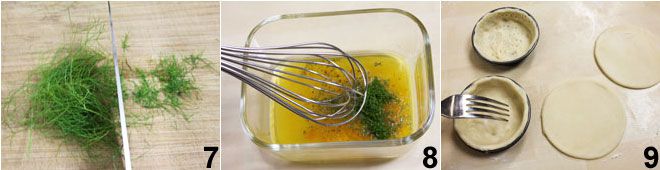 Hacke den Fenchel fein 7, halte ein paar Zweige für die endgültige Dekoration beiseite, füge ihn der Mischung hinzu und emulgiere mit dem Schneebesen 8. Bereite inzwischen die Mürbeteigschalen vor. Würze die Emulsion mit einer Prise Pfeffer und Salz. Bereite die Mürbeteigschalen vor, die für Einzelportionen von Tatar verwendet werden: rolle den Mürbeteig aus (du kannst eine bereits fertige Mürbeteigrolle verwenden), schneide 10 Kreise mit einem Durchmesser von etwa 10 cm aus und füttere 10 runde Förmchen mit einem Durchmesser von 8 cm aus, nachdem du sie gebuttert hast. Steche den Boden mit den Zinken einer Gabel ein 9 und backe sie blind, bedeckt mit getrockneten Hülsenfrüchten als Gewicht, nach der Technik des Blindbackens Wie man blind backt, im Ofen bei 180 Grad für 10-15 Minuten. Wenn sie goldbraun sind, nimm sie aus dem Ofen, lasse sie abkühlen und löse sie aus den Förmchen.