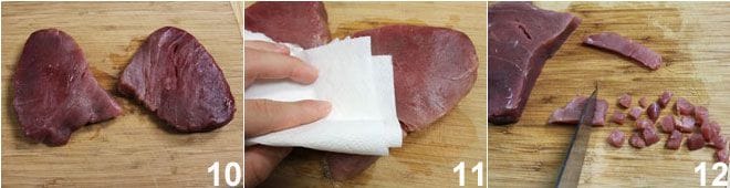 Verwenden Sie Thunfischsteaks: Stellen Sie sicher, dass Sie ordnungsgemäß getöteten Fisch gekauft haben. Es wird empfohlen, ihn für 96 Stunden bei -18 Grad einzufrieren und dann aufzutauen, um ihn im Rezept zu verwenden 10. Spülen und trocknen Sie die Thunfischfilets mit saugfähigem Papier 11. Schneiden Sie sie in kleine Würfel von etwa einem halben Zentimeter Dicke 12 und geben Sie sie in eine große Schüssel.
