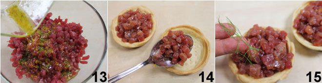 Gießen Sie die Öl-Orangen-Emulsion darüber 13 und mischen Sie, damit der Thunfisch gut gewürzt wird. Füllen Sie dann die Törtchen mit einem bis zwei Esslöffeln Thunfisch-Tatar 14 und dekorieren Sie Ihr Tatar mit ein paar Zweigen Fenchel 15.