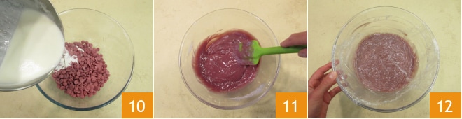 Sobald die Sahne den Siedepunkt erreicht hat, gießen Sie sie über die Ruby-Schokoladenperlen 10. Rühren Sie energisch mit einem Spatel 11 und emulgieren Sie alles leicht, dann decken Sie es mit Folie ab und stellen es für mindestens 2 Stunden in den Kühlschrank 12.