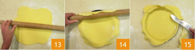 In der Zwischenzeit rollen Sie den Mürbeteig auf einer leicht bemehlten Arbeitsfläche aus und formen Sie einen Kreis von etwa 4 mm Dicke 13, wickeln Sie den Teig um das Nudelholz und rollen Sie ihn in eine 24-cm-Form 14 aus. Glätten Sie die Ränder mit einem glatten Messer 15.