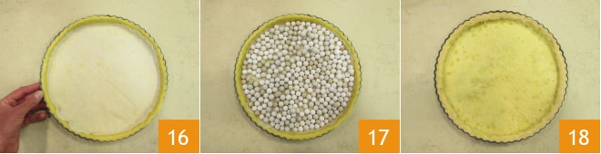 Legen Sie ein Blatt Backpapier auf den Boden des Mürbeteigs 16 und verwenden Sie Keramikgewichte für das Wie man blind backt 17: die Tarte backt im vorgeheizten statischen Ofen bei 180°C für etwa 20 Minuten 18.