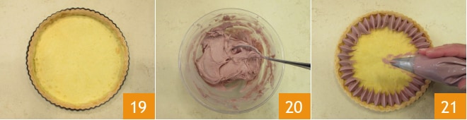 Nehmen Sie die Tarte aus dem Ofen, entfernen Sie das Backpapier und die Gewichte, und backen Sie sie weitere 5 Minuten bis zur goldbraunen Farbe 19. Während der Boden abkühlt, holen Sie die Ganache, arbeiten Sie sie energisch mit einem Löffel, bis sie wie aufgeschlagen aussieht 20. Füllen Sie die Creme in einen Spritzbeutel mit "Saint Honoré"-Tülle und beginnen Sie, die Tarte von außen nach innen zu garnieren 21.