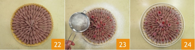 Vervollständigen Sie die Dekoration mit Ganachetupfen, um auch das Zentrum zu füllen 22 und fügen Sie einige Beeren und eine Prise Puderzucker obenauf hinzu 23. Ihre Tarte mit Ruby-Schokolade ist servierfertig 24.