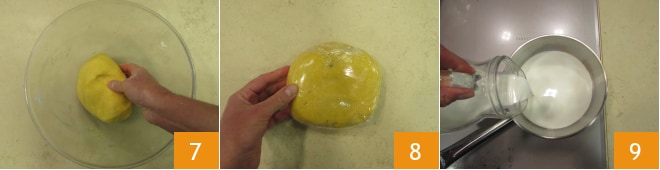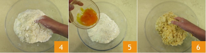 Verarbeiten Sie die Zutaten mit den Fingerspitzen zu einer groben, sandigen Masse 4, fügen Sie die Eigelbe hinzu 5 und kneten Sie schnell weiter 6.