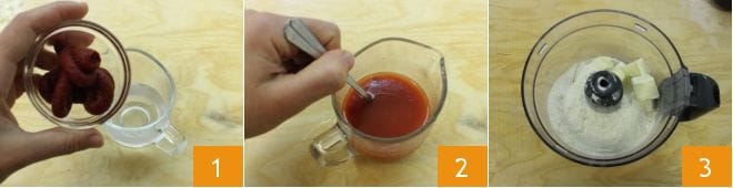 Um die Törtchen mit karamellisierten Zwiebeln und Stracciatella zuzubereiten, beginnen Sie mit der Zubereitung des Grundteigs nach unserem Rezept für Tomaten-Mürbeteig. Um den Tomaten-Mürbeteig zuzubereiten, beginnen Sie damit, das Tomatenmark im Eiswasser zu verrühren (1-2). Fahren Sie mit der Sandtechnik fort: Geben Sie in einen Mixer das gesiebte Mehl, die kalte Butter in Stücken aus dem Kühlschrank 3, eine Prise Salz, und mixen Sie alles, bis eine sandige Mischung entsteht.