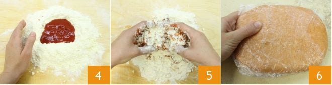 Legen Sie die entstandene Mischung auf eine bemehlte Arbeitsfläche in der klassischen Brunnenform und geben Sie in die Mitte das im Wasser verdünnte Tomatenmark 4, kneten Sie alles schnell 5, bis ein kompakter, fester und ziemlich elastischer Teig entsteht. Sobald er fertig ist, wickeln Sie Ihren Mürbeteig in Frischhaltefolie 6 und lassen Sie ihn mindestens 40 Minuten im Kühlschrank ruhen.