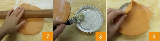 Nach den 40 Minuten ist der Mürbeteig bereit zur Verwendung. Legen Sie den Mürbeteig auf eine leicht bemehlte Arbeitsfläche und rollen Sie ihn mit einem Nudelholz 7 sehr dünn aus, etwa 3-4 mm. Fetten 8 und bemehlen Sie die gewählten Törtchenformen für das Backen und legen Sie den Teig auf die Form 9.