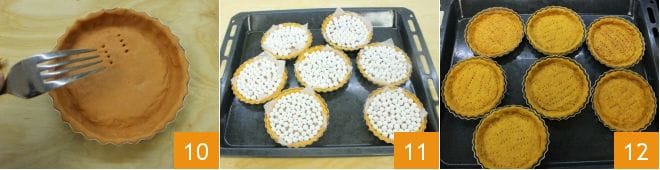 Drücken Sie ihn gut an und stechen Sie den Boden des Teigs mit den Zinken einer Gabel ein 10. Jetzt fahren Sie mit dem Blindbacken fort, indem Sie unserem Leitfaden Wie man Blindbacken macht folgen. Legen Sie in die Form getrocknete Hülsenfrüchte oder geeignete Gewichte für diese Backtechnik wie Keramikkugeln 11. Backen Sie den Teig etwa 15 Minuten im vorgeheizten Ofen bei 180 Grad. Nehmen Sie ihn nach dem Backen heraus und entfernen Sie die Gewichte, lassen Sie ihn abkühlen 12.