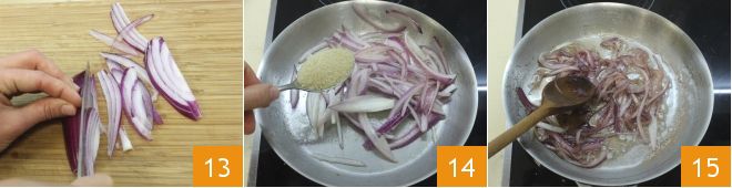 Bereiten Sie die Füllung vor: Schneiden Sie die Zwiebeln 13 und geben Sie sie in eine Pfanne, in der Sie die Butter geschmolzen haben. Lassen Sie sie leicht weich werden und fügen Sie dann den braunen Zucker hinzu 14 und lassen Sie sie bei niedriger Hitze kochen, bis sie karamellisiert sind 15.