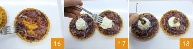 Fahren Sie mit dem Füllen fort: Legen Sie eine Schicht karamellisierter Zwiebeln 16. Nehmen Sie die Burrata und entnehmen Sie die Stracciatella, lassen Sie sie abtropfen, damit sie so trocken wie möglich ist, dann zupfen Sie sie auseinander und legen Sie sie auf die Törtchen 17, in die Mitte fügen Sie eine eingerollte Sardelle hinzu und zuletzt eine Kapernblüte 18. Ihre Törtchen mit karamellisierten Zwiebeln und Stracciatella sind servierbereit.
