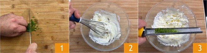 Um die Lachs-Häppchen vorzubereiten, hacken Sie zuerst den Schnittlauch fein 1. Geben Sie den Frischkäse in eine Schüssel, lockern Sie ihn mit einem Schneebesen auf 2 und fügen Sie die Limettenschale hinzu 3.
