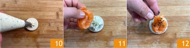 Füllen Sie jede Scheibe mit einem großzügigen Klecks der Käsemischung 10, legen Sie den Lachs darauf 11 und garnieren Sie mit schwarzem Sesam 12.