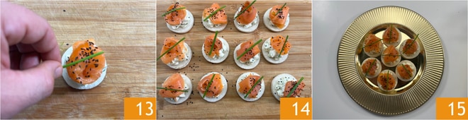 Vervollständigen Sie mit etwas Schnittlauch 13. Sobald sie fertig sind 14, legen Sie sie auf eine Servierplatte 15. Ihre Lachs-Häppchen sind bereit zum Servieren!