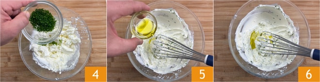 Fügen Sie auch den Schnittlauch hinzu 4 und mischen Sie. Gießen Sie das Öl hinein 5 und mischen Sie erneut 6.