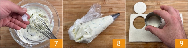 Schmecken Sie mit Salz ab 7 und mischen Sie ein letztes Mal. Geben Sie die Mischung in einen Spritzbeutel mit einer Tülle Ihrer Wahl 8; wir haben eine gewellte verwendet. Lassen Sie die Creme im Kühlschrank ruhen, bis sie verwendet wird. Schneiden Sie das Sandwichbrot mit einem Ausstecher von 5 cm Durchmesser 9; Sie erhalten 12 Stück. Schneiden Sie den geräucherten Lachs in Streifen.