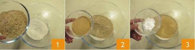 Um die Teff-Kekse zuzubereiten, erhitzen Sie zunächst die Milch in einem kleinen Topf, ohne sie zum Kochen zu bringen. In der Zwischenzeit das Teff-Mehl, das Haselnussmehl 1, den Rohrzucker 2 und das Backpulver 3 in einer Schüssel vermischen.