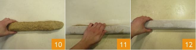 Nach der Ruhezeit nehmen Sie den Teig und formen ihn zu einer Rolle von etwa 30 cm Länge 10. Wickeln Sie die Rolle in ein Blatt Backpapier 11, indem Sie die Kanten während des Einrollens auf die Arbeitsfläche drücken, um eine quadratische Form zu erhalten 12. Legen Sie das Päckchen etwa 20 Minuten in den Gefrierschrank, um es zu festigen.