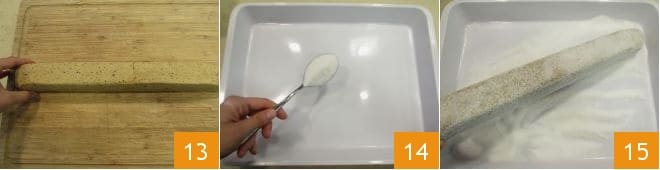 Nach der Kühlzeit entfernen Sie das Backpapier 13 und bestreuen Sie ein Tablett mit Zucker 14, dann rollen Sie die Rolle im Zucker, um sie gleichmäßig zu bedecken 15.