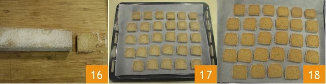 Schneiden Sie die Rolle nun in etwa 1 cm dicke Scheiben 16 und legen Sie die entstandenen Quadrate auf ein mit Backpapier ausgelegtes Backblech 17. Mit diesen Mengen erhalten Sie etwa 35 Kekse. Backen Sie die Kekse in einem vorgeheizten statischen Ofen bei 170°C für ca. 30-35 Minuten auf der mittleren Schiene. Wenn sie gleichmäßig goldbraun sind 18, aus dem Ofen nehmen und abkühlen lassen: Ihre Teff-Kekse sind bereit zum Genießen!