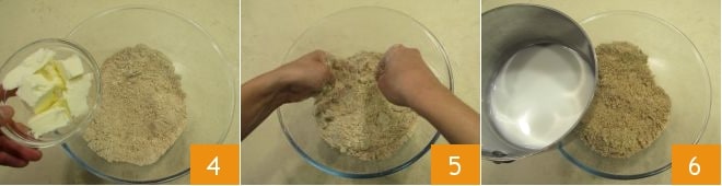 Fügen Sie die kalte Butter in Stücken aus dem Kühlschrank 4 hinzu und zerbröseln Sie sie mit den Fingerspitzen in die Mischung 5. Gießen Sie nun die warme Milch 6 hinzu und rühren Sie kurz um, um die Mischung zu glätten.