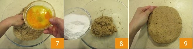 Fügen Sie die verquirlten Eier hinzu 7 und kneten Sie mit den Händen, um sie mit den restlichen Zutaten zu vermischen. Bevor die Mischung völlig homogen ist, fügen Sie auch das Reismehl hinzu 8 und kneten Sie weiter, bis ein gleichmäßiger Teig entsteht 9. Wickeln Sie den Teig in Frischhaltefolie und lassen Sie ihn mindestens 30 Minuten im Kühlschrank ruhen.