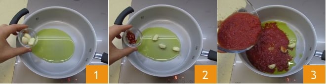 Um die Auflaufform mit neapolitanischem Kabeljau zuzubereiten, kochen Sie zuerst die Tomatensauce: In einer Pfanne mit etwas extra nativem Olivenöl den geschälten Knoblauch anbraten 1, dann die zerkleinerte Chilischote hinzufügen 2 und nach ein paar Minuten Anbraten das Tomatenfleisch hinzufügen 3 und etwa 15 Minuten kochen lassen.