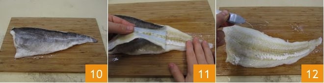 In der Zwischenzeit den Kabeljau 10, bereits entsalzt (falls er gesalzen war, müssen Sie ihn 3 Tage lang in Wasser legen und das Wasser 2-3 Mal am Tag wechseln, um ihn zu entsalzen), die Haut entfernen 11 und die Gräten mit einer Pinzette herausnehmen.