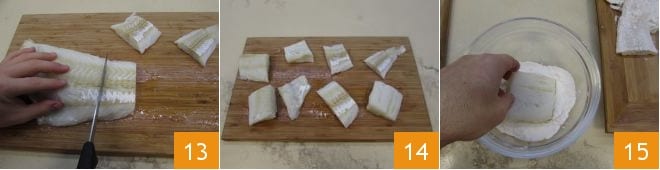 Schneiden Sie ihn 13 in 8 Stücke 14, dann in einer Schüssel mit Mehl jedes Stück gut mehlieren, überschüssiges Mehl abklopfen, indem Sie es vorsichtig gegen die Ränder der Schüssel klopfen, in der Sie das Mehl haben.
