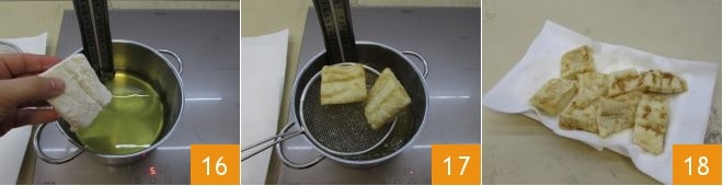 In einem kleinen Topf das Pflanzenöl einfüllen und erhitzen, bis es eine Temperatur von 180°-190° erreicht hat, dann die Kabeljaustücke frittieren und um zu vermeiden, dass die Öltemperatur stark abfällt, frittieren Sie 2 Stücke auf einmal, für etwa 2-3 Minuten, je nach Dicke. Sobald sie gar sind, auf saugfähigem Papier abtropfen lassen 18.