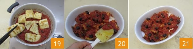 Den Kabeljau zur Sauce in die Pfanne geben 19, ein paar Minuten ziehen lassen, dann die Mischung in eine Auflaufform 20 geben, den Kabeljau mit den Tomaten bedecken und im vorgeheizten Ofen bei 160° 20 Minuten fertig garen. Aus dem Ofen nehmen, mit gehackter Petersilie garnieren und Ihre Auflaufform mit neapolitanischem Kabeljau ist servierfertig! 21
