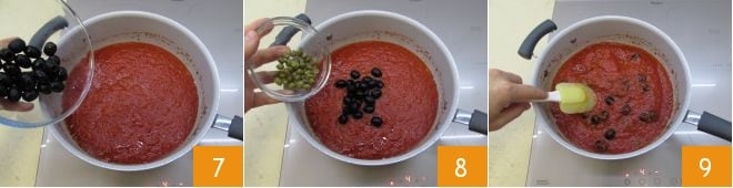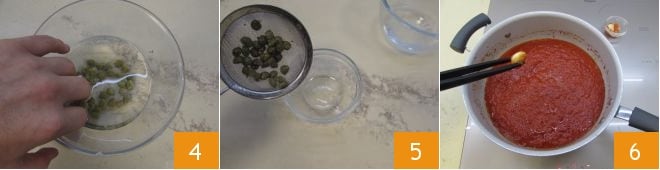 In der Zwischenzeit die Kapern entsalzen, indem Sie sie in eine Schüssel mit kaltem Wasser tauchen 4 und dann abseihen 5, bis sie bereit sind, der Pfanne hinzugefügt zu werden. Wenn die Sauce fertig gekocht ist, den Knoblauch aus der Pfanne nehmen 6,
