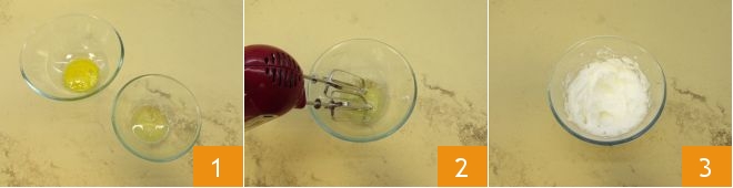 Um den Teig für Frittiertes zuzubereiten, trennen Sie zuerst die Eigelbe von den Eiweißen 1. Dann schlagen Sie die Eiweiße mit einem elektrischen Mixer steif (2-3).