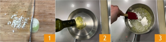 Um die Nüdelchen mit Tomaten vorzubereiten, schälen Sie die Zwiebel und hacken Sie sie 1. Erhitzen Sie das Öl in einem Topf 2 und geben Sie die Zwiebel hinzu 3, eine Prise Salz und lassen Sie sie goldbraun werden.