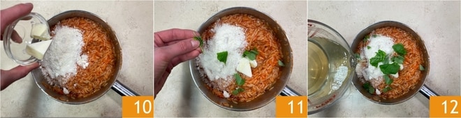 Am Ende der Garzeit, rühren Sie den Käse und die kalte Butter unter 10, aromatisieren Sie mit Basilikumblättern 11 und falls nötig, fügen Sie noch ein wenig Brühe hinzu 12, gerade genug, um das Gericht cremig zu machen.