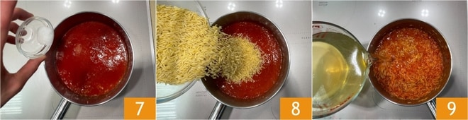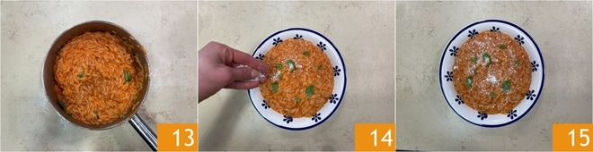 Die Nüdelchen mit Tomaten sind fertig 13, würzen Sie sie nach Belieben mit einer Prise geriebenem Parmigiano Reggiano 14 und servieren Sie sie sofort 15.