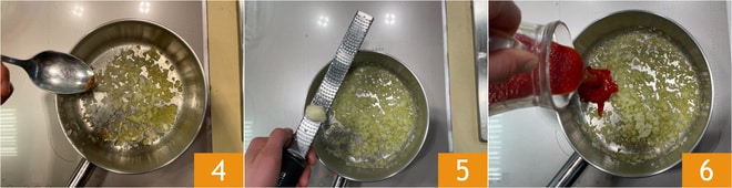 Fügen Sie auch den Chili 4 und die Basilikumstiele hinzu, sobald die Zwiebel glasig ist, fügen Sie den geriebenen Knoblauch hinzu 5. Braten Sie es noch ein wenig an, um es weicher zu machen. Geben Sie das Tomatenpüree hinzu 6.