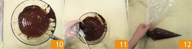 Rühren Sie die Schokolade um und erhitzen Sie sie erneut in der Mikrowelle (nur wenige Sekunden, rühren und messen Sie die Temperatur erneut) oder im Wasserbad, bis sie eine Temperatur von 31°C erreicht hat, die ideal für die Verarbeitung ist. Die Schokolade ist nun temperiert, füllen Sie sie in einen Spritzbeutel 11 12 und verwenden Sie sie sofort für Ihre Kreationen, wir zeigen Ihnen einige Beispiele.