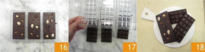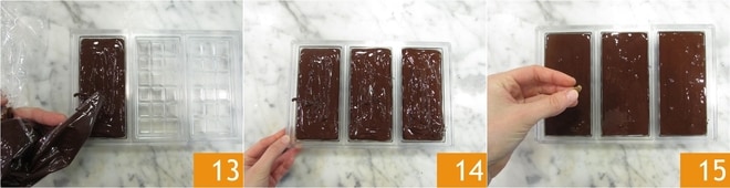 Nachdem Sie die Zartbitterschokolade temperiert haben, geben Sie sie in eine Form für Tafeln, bis zum Rand 13. Bewegen Sie die Form, indem Sie sie vorsichtig klopfen, um eventuelle Luftblasen zu entfernen 14 und warten Sie einige Sekunden, bevor Sie die Nüsse hinzufügen 15.
